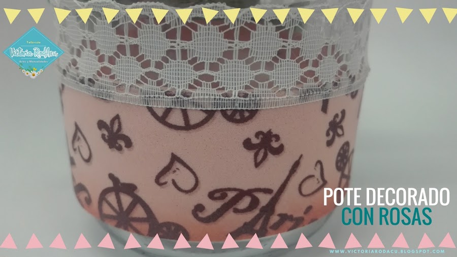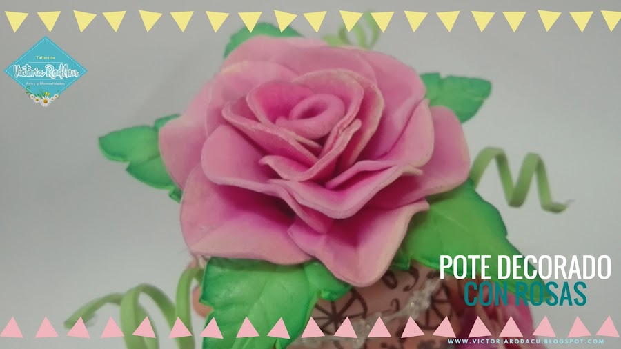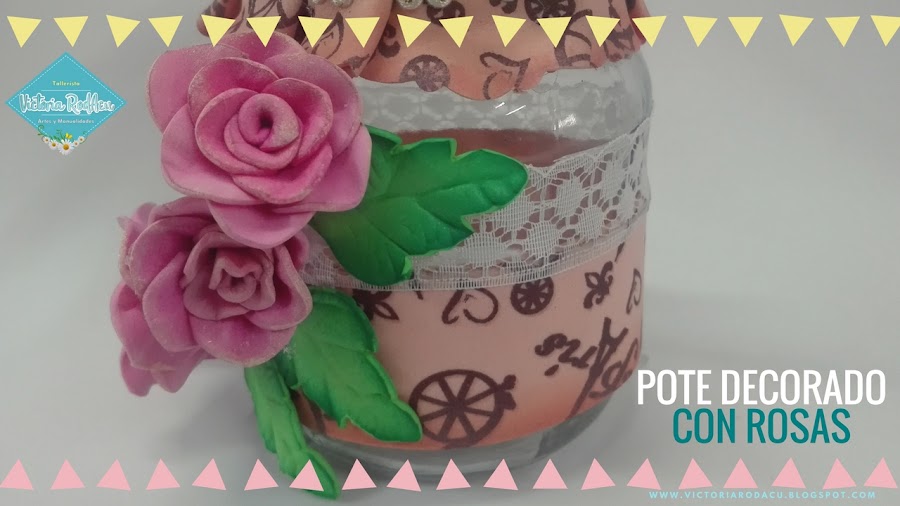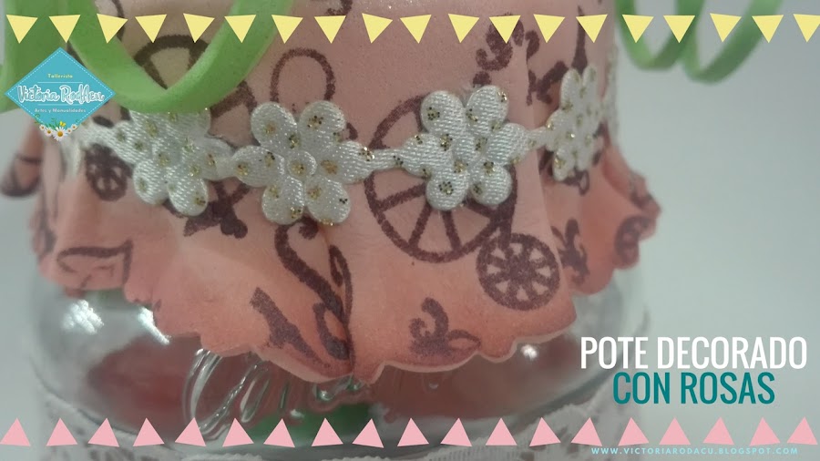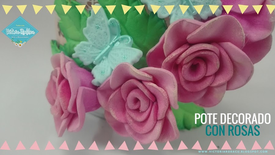 Sobre el pote, un pequeño ramillete de rosas pequeñas que engalardonan y completan la decoración de este hermoso proyecto.