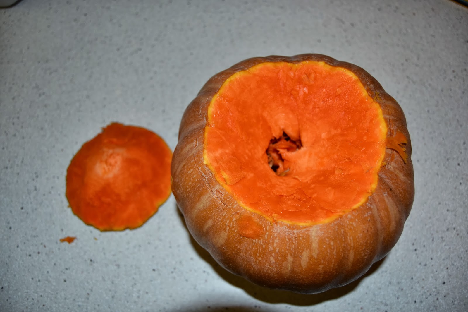 Es importante hacer el corte en V, porque después tenéis que colocar otra vez la tapa y así se aguanta. Acordaos de esto. Otra cosa importante es que en el agujero quepa vuestra mano. Es tentador hacerlo pequeño para que quede chulo, pero facilita las cosas que podáis meter la mano. Aquí veis el corte en V. 3. Vaciar. Aqui si tenéis niños que sean de fiar, podéis ponerlos a vaciar las pepitas y las fibras. Luego vosotros podéis ir haciendo más hueco con la cuchara (yo no tenía pero cuando lo hacía pensé que una cuchara para helados sería PERFECTA), y os turnáis para que el sobrante lo quiten ellos.