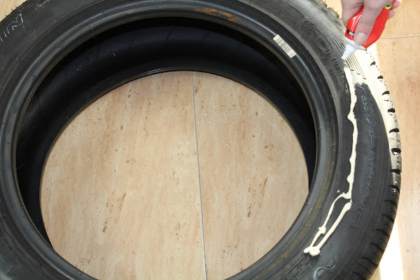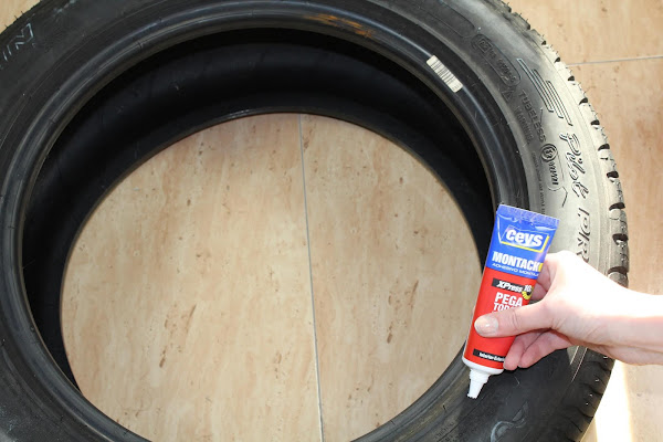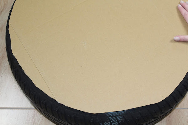 1 Paso: Recortar dos círculos de cartón de la medida del neumático. Pegar el cartón al neumático con montack.