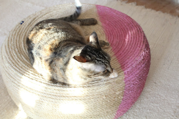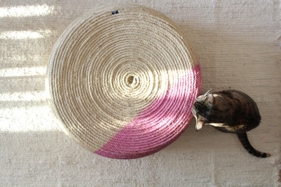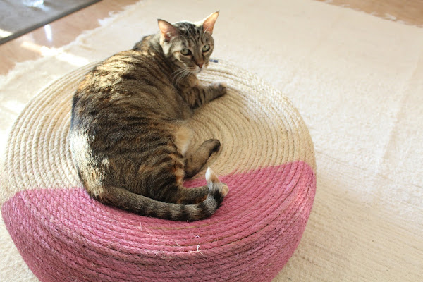 Una vez todo el neumático forrado hay que dejarlo secar unas 24 horas. Os dejo un resumen de fotografías donde veréis como le gusta este nuevo rascador a la reina de la casa.