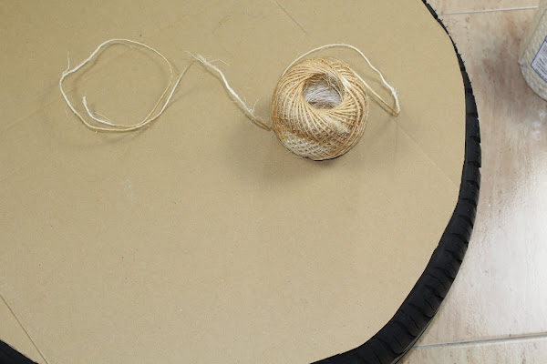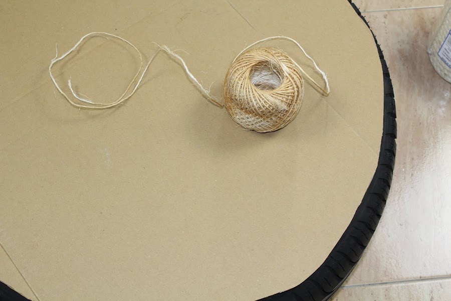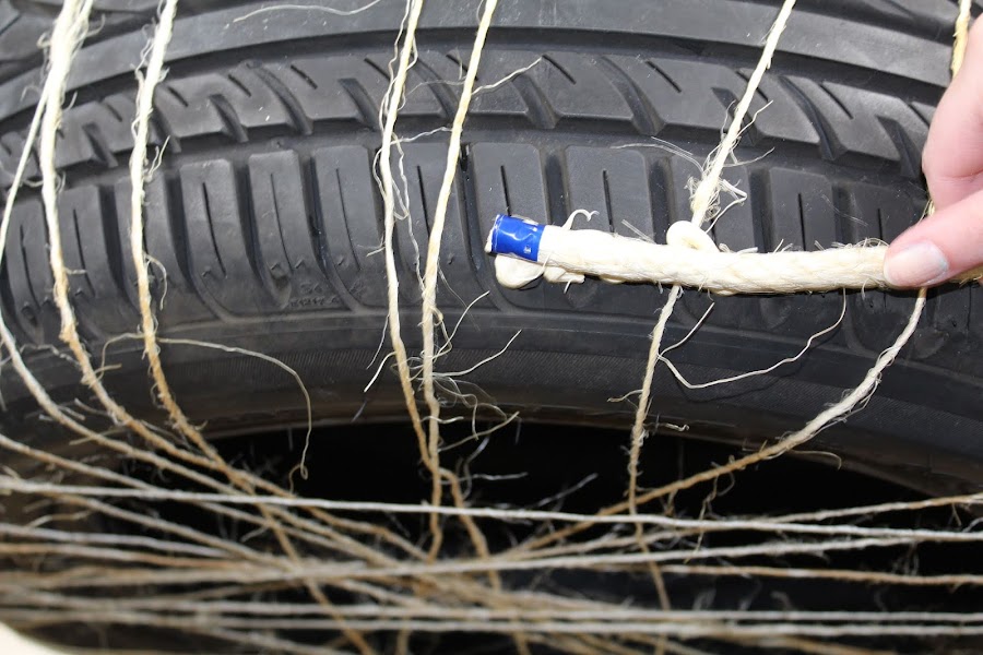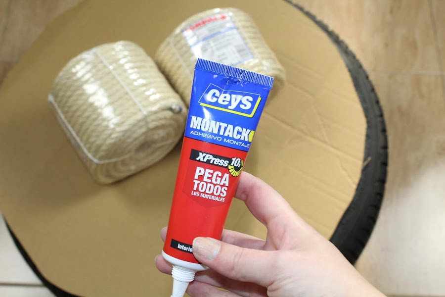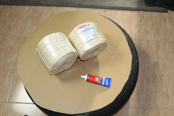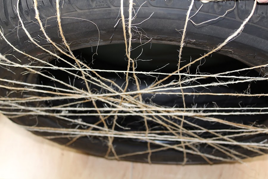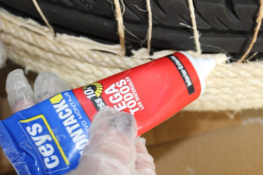3 Paso: Forrar el neumático con una cuerda gruesa, poner bastante cantidad de montack en la primera fila. Además como truco, os recomiendo que dejéis secar unas horas las primeras vueltas antes de seguir.