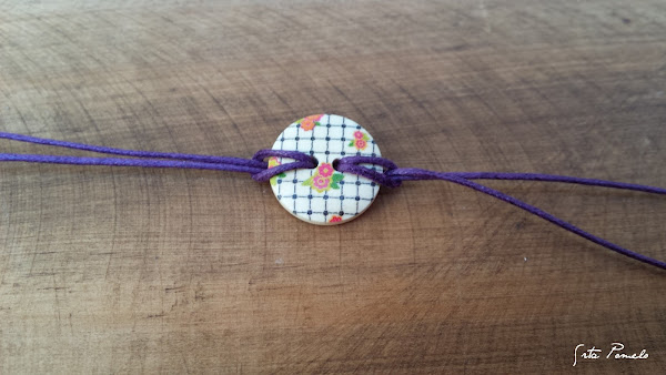 Cortamos un cordón por la mitad, una para cada agujerito del botón. Doblamos el cordón cortado por la mitad y lo introducimos por el agujero, justo por la parte de atrás del botón. Luego introducimos el resto por dentro del bucle (como se muestra en la foto) y tiramos para ajustar. Acabamos de hacer el nudo alondra.