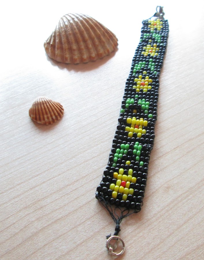 6. Para cerrar la pulsera, pasamos la hebra unas cuantas veces por los hilos del telar, (tanto en el comienzo como en el final) ponemos un poco de pegamento, y el cierre de bisutería que más nos guste.