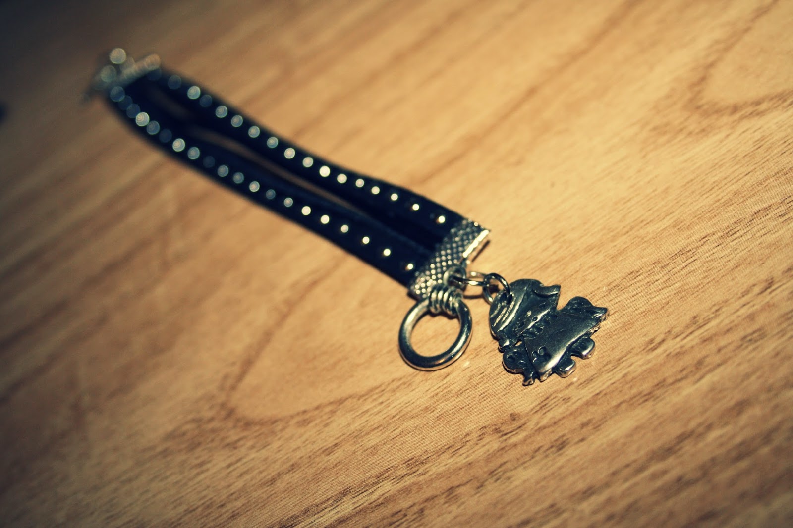 Primero puse el colgante zamak en la mitad de un cordón de cuero pero al ser una pieza pesada (aunque sea pequeña, lo puse finalmente en uno de los extremos de un cierre para que quede colgando hacia abajo)