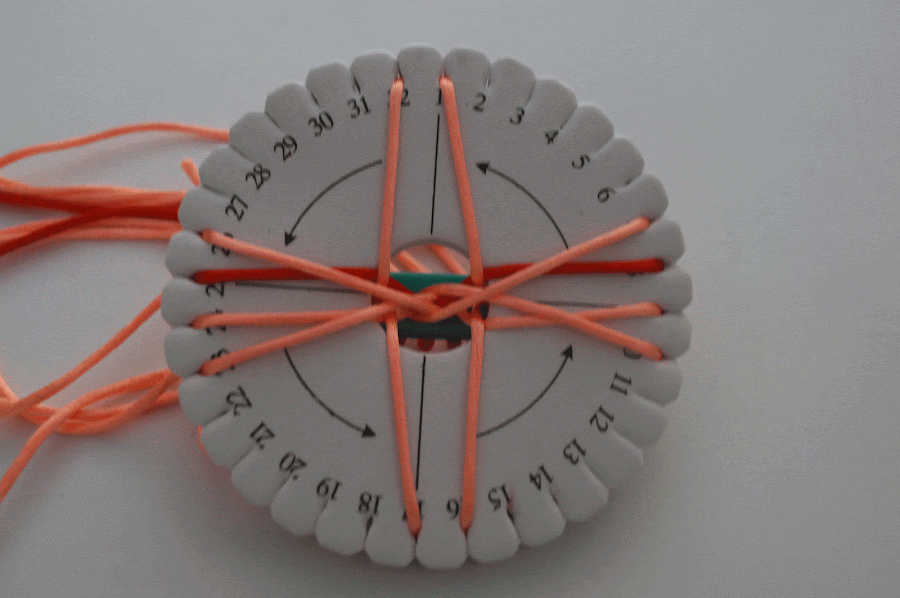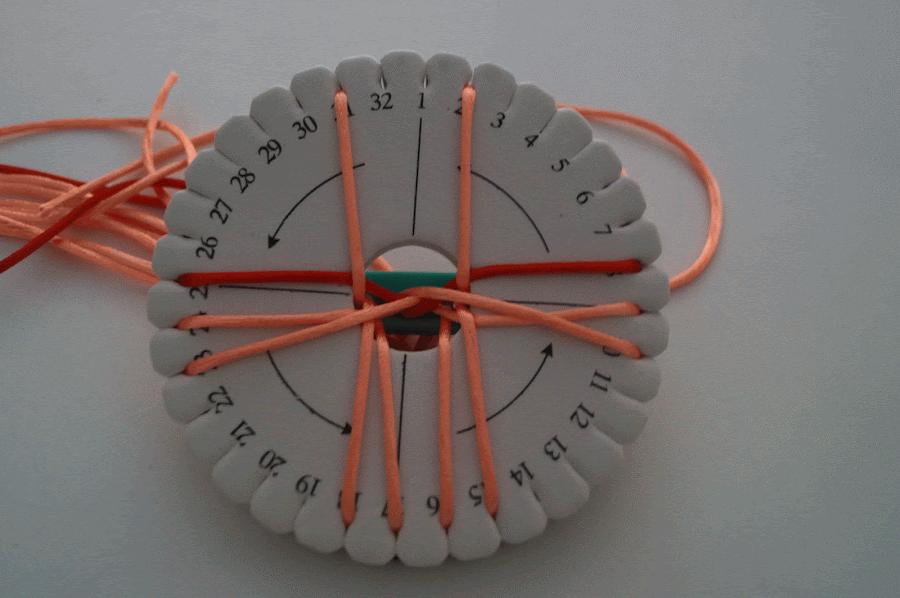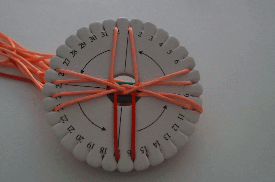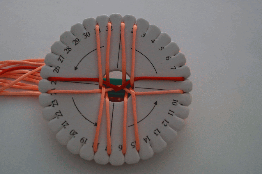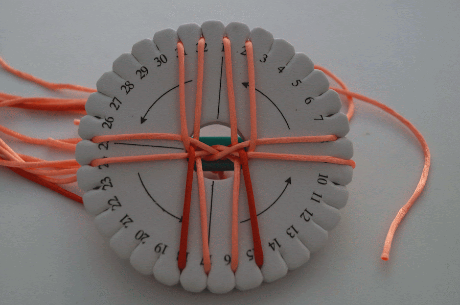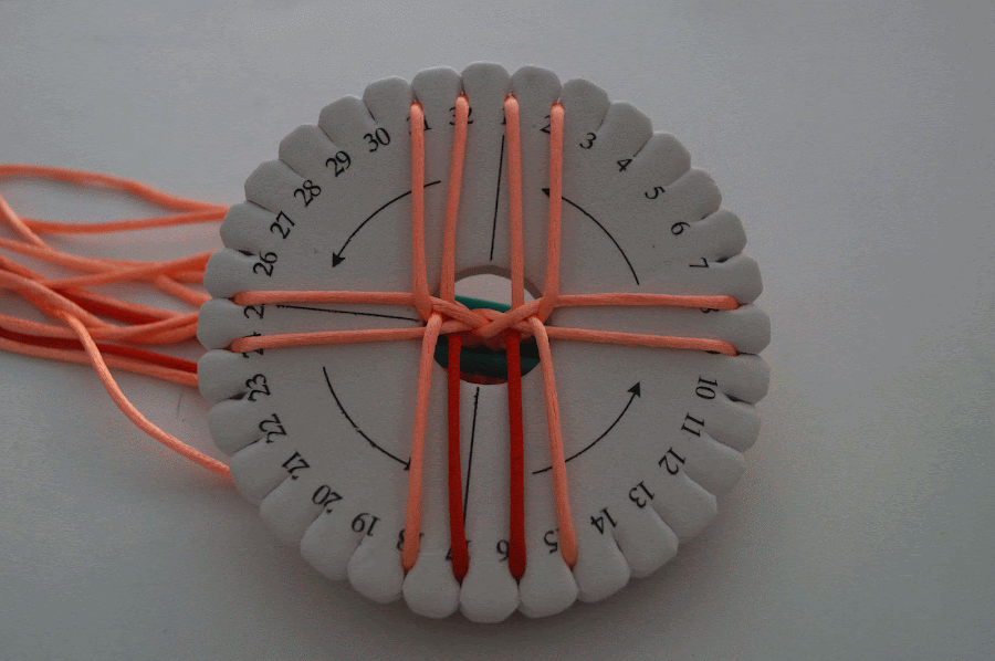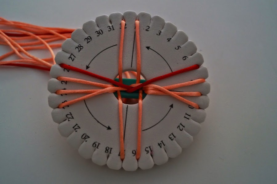 Necesitamos: 1 Disco Kumihimo, 10 tiras de color salmón, y 2 rojas (de 30 cm aprox)