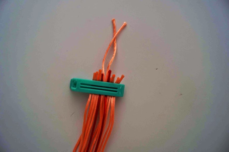 Unimos las tiras con una pinza. En este caso, como el terminal va a ser con un nudo corredizo, he dejado un par de tiras de color naranja más largas que el resto.