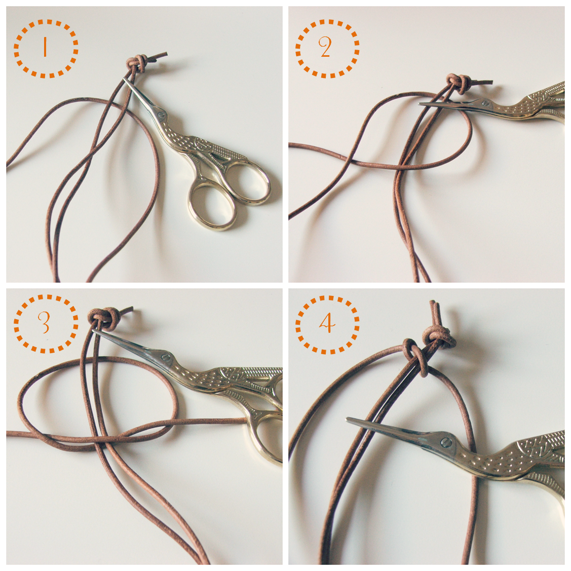 Primero juntamos los dos cordones de 30 centímetros y hacemos un nudo en uno de los extremos para que no se nos mueva.