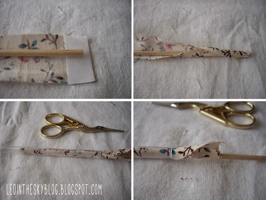 Luego hay que ir introduciendo poco a poco la brocheta con la tela dentro del tubo teniendo cuidado de enrollar la tela sobre la brocheta a la vez. Es decir, vamos haciendo una especie de tubito de tela con ayuda del palo de brocheta. Una vez que la tela sobresale por los dos lados del tubo, despegamos con cuidado el palo de brocheta de la tela y cortamos la tela dejando que sobresalga un poco del tubo.