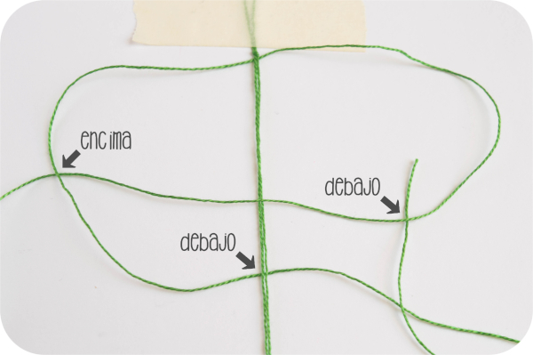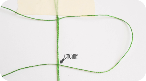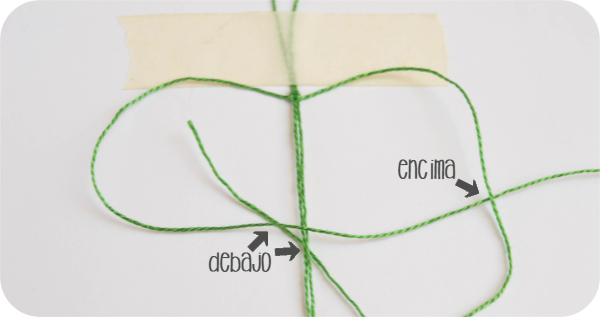 Ahora con el otro hilo mas largo pásalo por detrás de este y centralo para tener el mismo largo por cada lado.