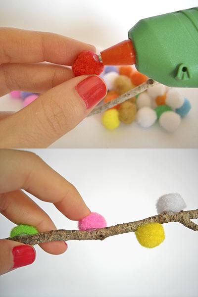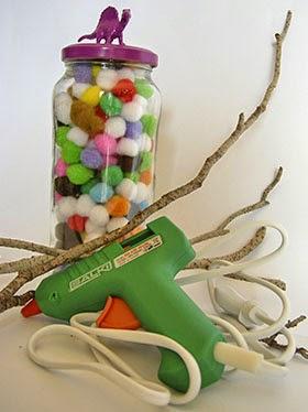 Pompones de colores. Podréis encontrarlos en cualquier tienda de manualidades o en tiendas multiprecio por muy poco dinero. Otra posibilidad, si queréis colores muy específicos, es hacer vosotros mismos las bolitas con lana fieltrable, como explica en su página Wayaiulandia. Pero si queréis hacerlo rápido y fácil los pompones de los chinos son perfectos. Por cierto, si os gusta el bote de cristal con la tapa decorada, encontraréis el tutorial para hacerlo aquí.