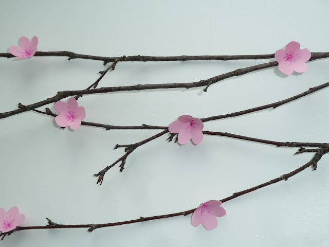 5. Una vez que tengas tus florecillas listas, coge la pistola de pegamento caliente y empieza a pegar flores en las ramitas! Para ello, escoge donde quieres que vaya tu flor, pon una gotita de pegamento, colora la flor encima y presiona ligeramente hasta que la flor quede sujeta. Como el pegamento seca muy rápido esto no tardará y tendrás tus ramitas de cerezo listas en un periquete!