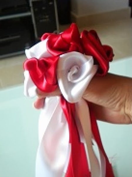Aún quedan días de invierno y mal tiempo pero ya están los escaparates anunciándonos la primavera, así que para ir dándole la bienvenida unas flores?.. Me pidieron que hiciera un ramo de novia y estos ramos de tela siempre me han encantado así que manos a la obra Hice flores de varios tipos, luego forré los tallos con lazo de organza , los cosí a las flores, les puse unos abalorios de strass pega ...