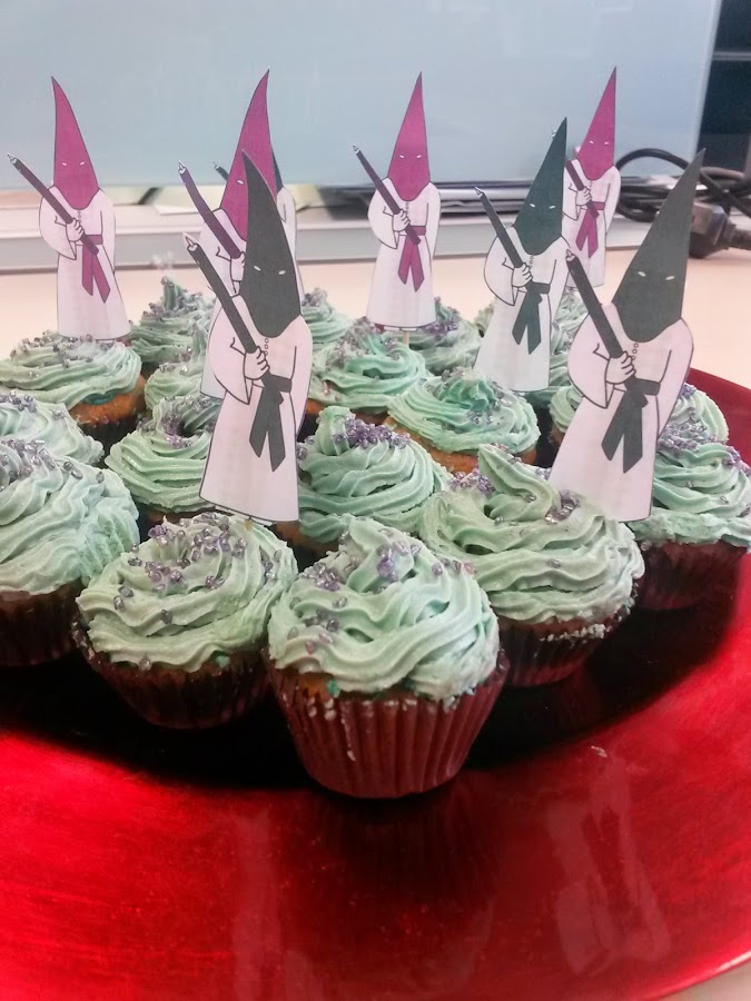 Llena una manga pastelera con toda la mezcla y pon la boquilla que más te guste. Ve una por una cubriéndolas con la buttercream y cuando finalices, espolvorea con los adornos que más rabia te den. También puedes añadirles una mini oreo o galleta María si has optado por ese sabor. Hay infinidad de decoraciones, yo, en este caso, como era para un desayuno de Semana Santa, imprimí nazarenos y los pegué en palillos de dientes. Sólo tuve que pincharlos en los cupcakes y voilà.