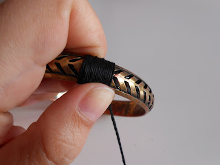 Cortamos un trozo un poco larguito de hilo de crochet y, en el caso de mis pulseras que están huecas por donde el dibujo, hacemos un nudito para que aguante el inicio. Si fueran lisas lo que podéis hacer es hacer un nudo alrededor de la pulsera y poner una gota de pegamento por dentro, así no se moverá y lo podremos tapar.