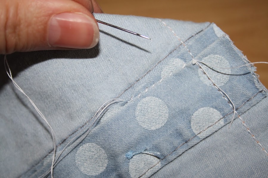 Como veis, se trata de una blusa sin mangas de color azul que en la misma tela tiene unos topos dibujados. Me pareció ideal para convertirla en cojín.