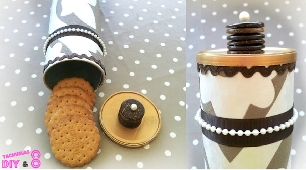 Cómo hacer un bote decorativo para la cocina con papel ,cintas y botones