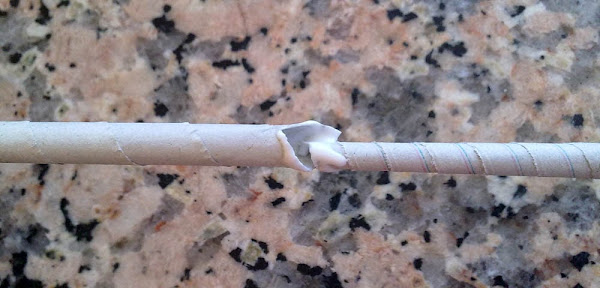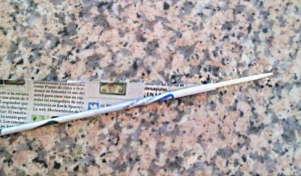 Cogemos el palillo de madera y empezamos a enrrollarlo en diagonal, como veis en la foto. Desde una esquina del periódico empezamos a enrrollarlo haciendo un tubo largo.