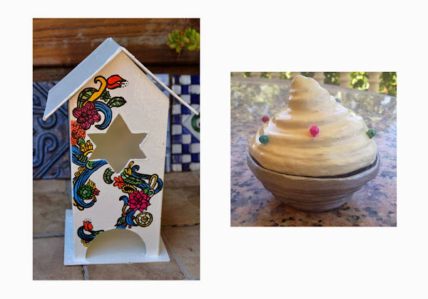 Estos son dos trabajos que hice para un regalo de reciclaje, una casita para guardar las bolsitas de té hecha con cartón y una cajita en forma de cupcake con papel de periódico.