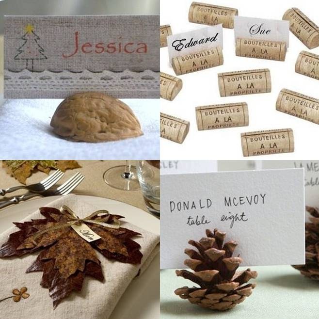 Reciclamos unas nueces, unos corchos de botella, unas hojas de árbol y unas piñas y le diseñamos unos cartelitos con el nombre de los comensales.