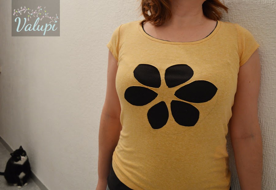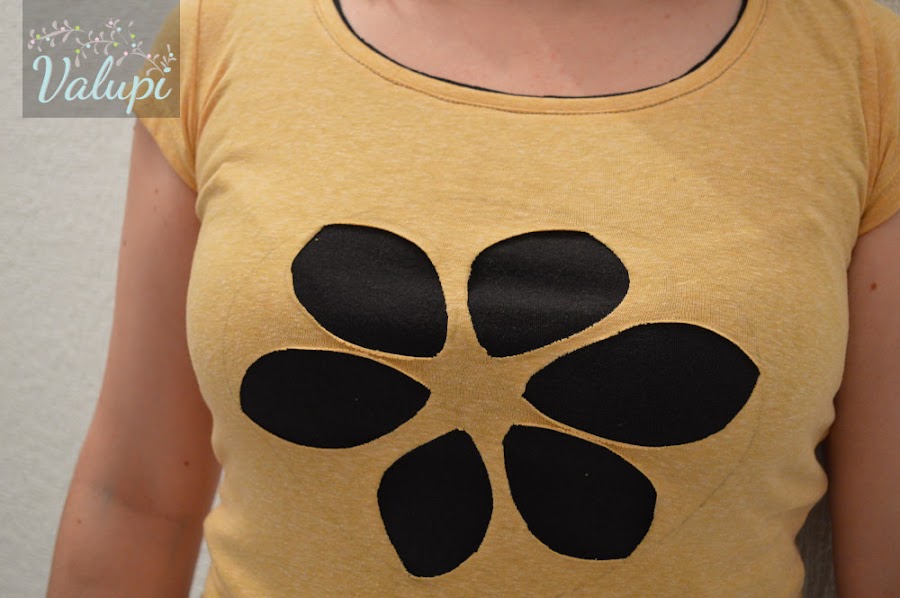 Comencé cortando las mangas de la camiseta negra, cosí las dos camisetas por el cuello siguiendo la costura de la amarilla y recorté el sobrante del cuello de la camiseta negra. Luego marqué un círculo en el centro, hice un dibujo a lápiz y recorté los pétalos de la flor. Muy importante: hay que poner un cartón o revista gorda entre las camiseta para cortar solo la superior, que a mi casi se me va la tijera y la lío jeje.