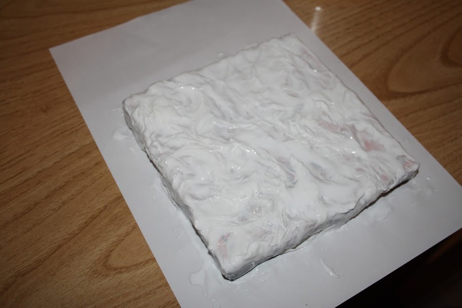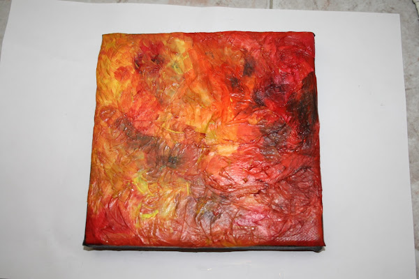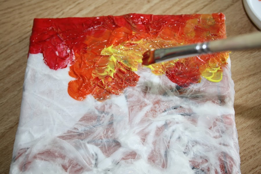 Arrugamos con la ayuda de los dedos y le vamos a aplicar la cola. Sed generosos porque la idea es que el cuadro quede completamente empapado del pegamento. Puede ser un poco pringoso y quizá el resultado no parezca aparentemente el deseado pero una vez seco, la textura cambia por completo