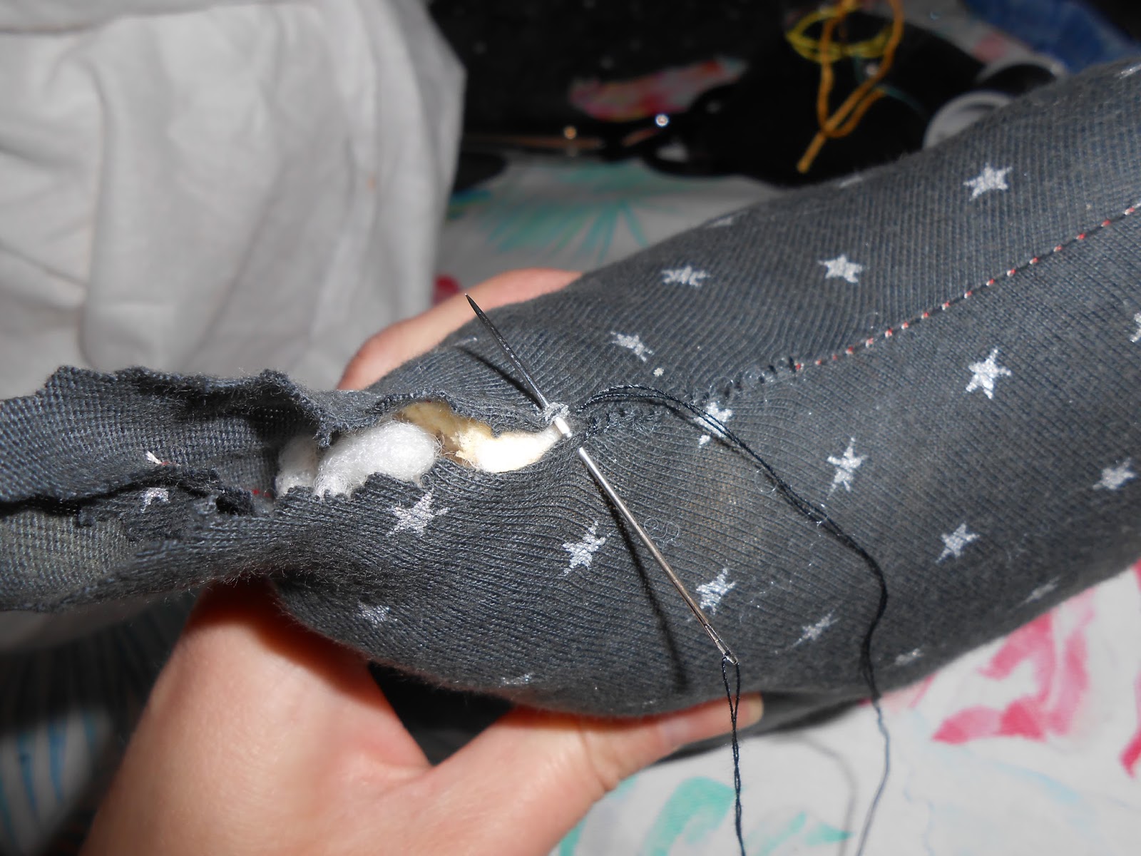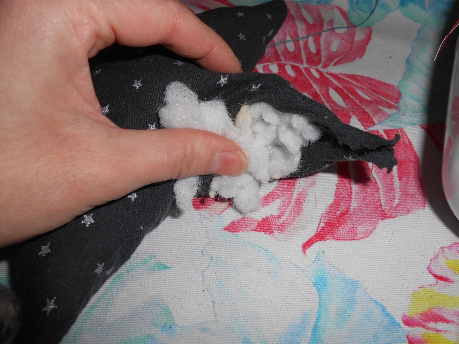 Damos la vuelta y rellenamos con la guata o trozos de espuma, lanas, etc. Debemos asegurarnos que el muñeco queda bien relleno y que no hay ninguna esquina del peluche que quede semivacía.