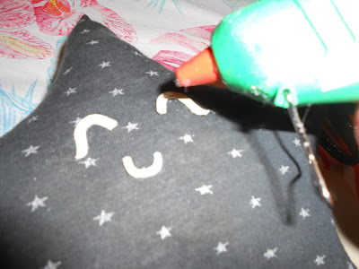 Cortamos unos ojitos y la boca del trozo de polipiel y la pegamos con pegamento de tela o con pistola de silicona.