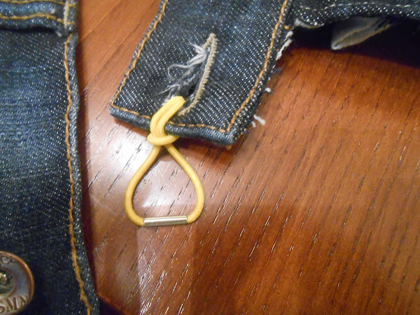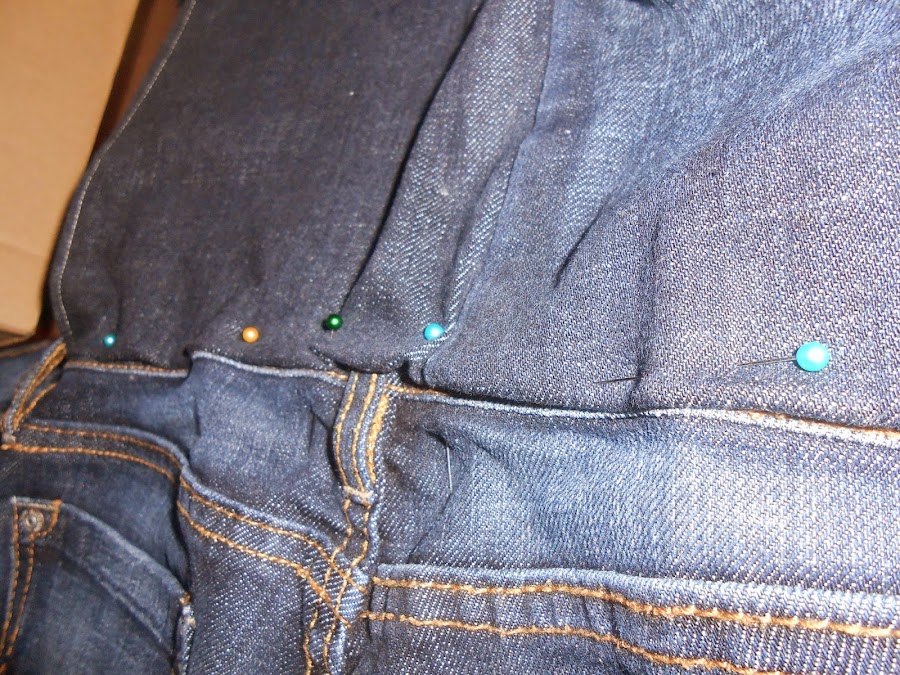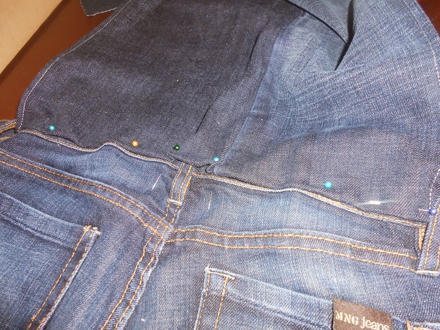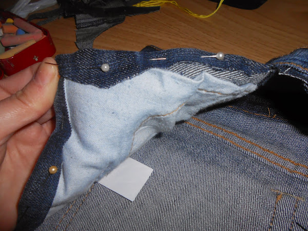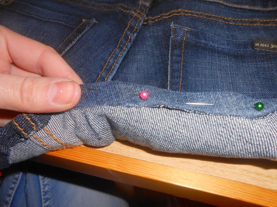 8/ Cogemos la pernera que habíamos apartado y cosemos unas pequeñas costuras a lo largo de la pieza de tela.