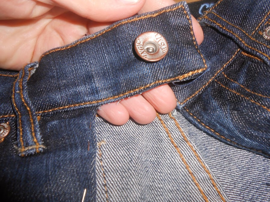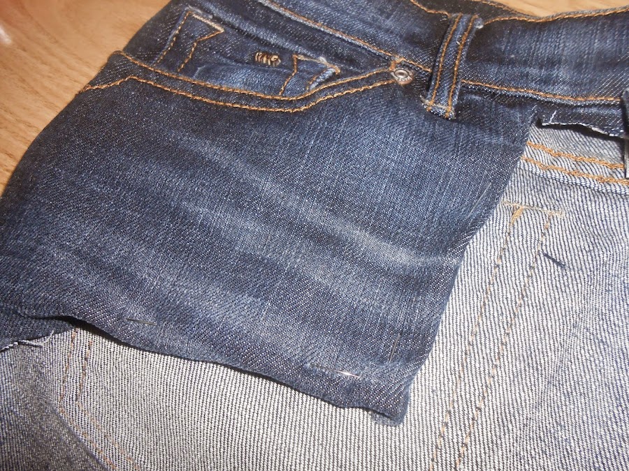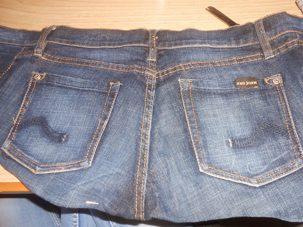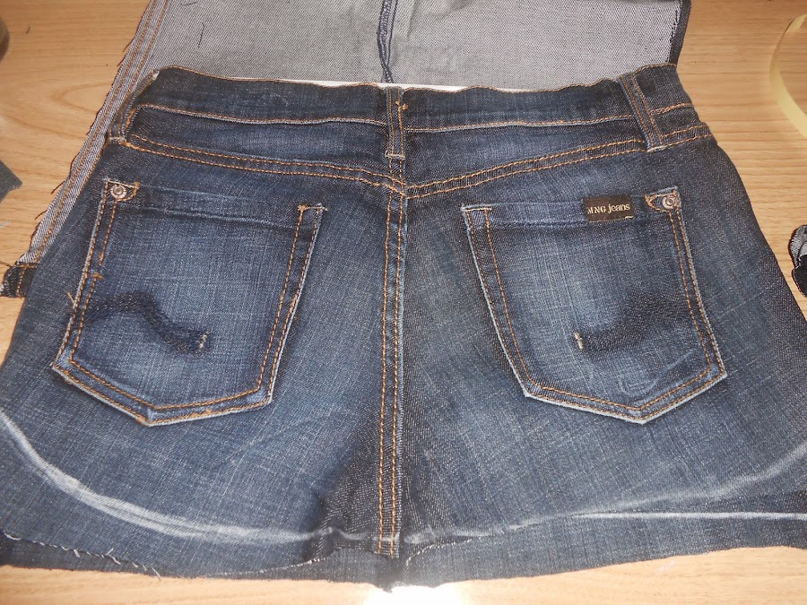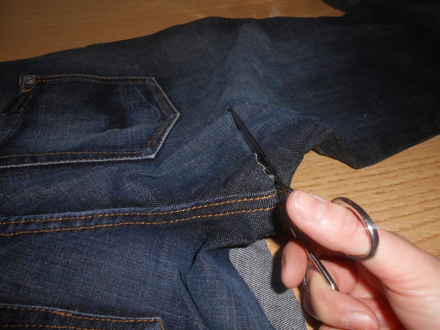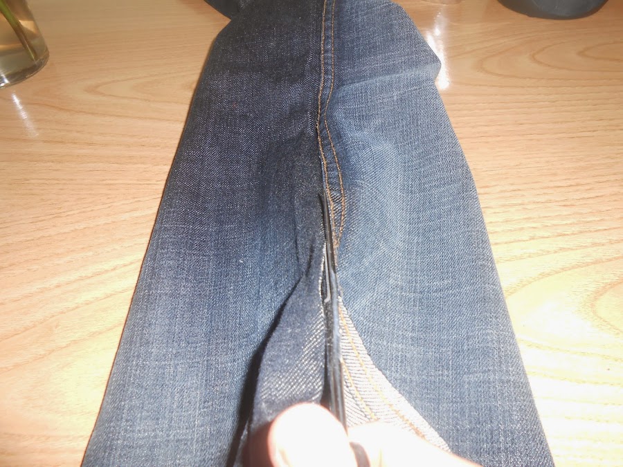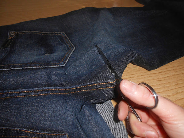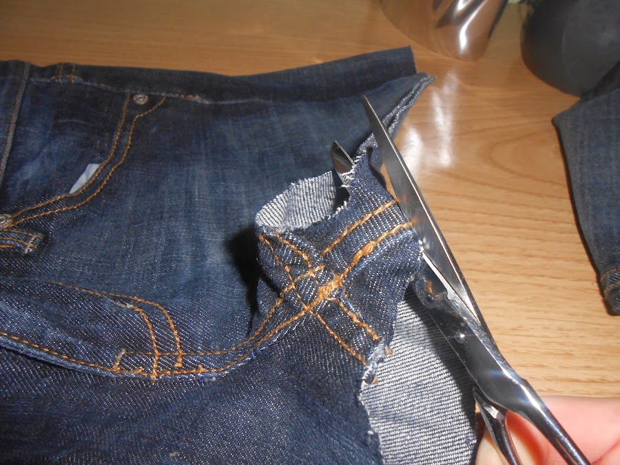 1/Cortamos el vaquero por la zona de la cadera (a modo de short) y posteriormente cortamos el hueco que queda entre las perneras.
