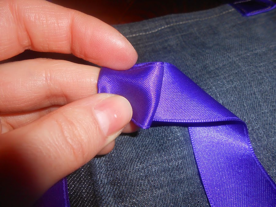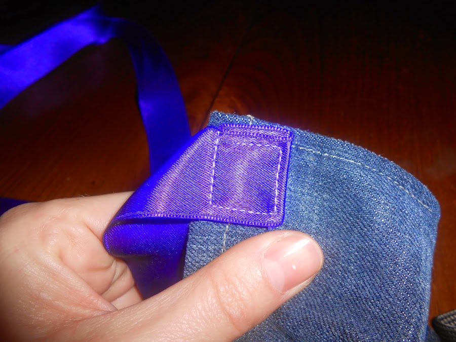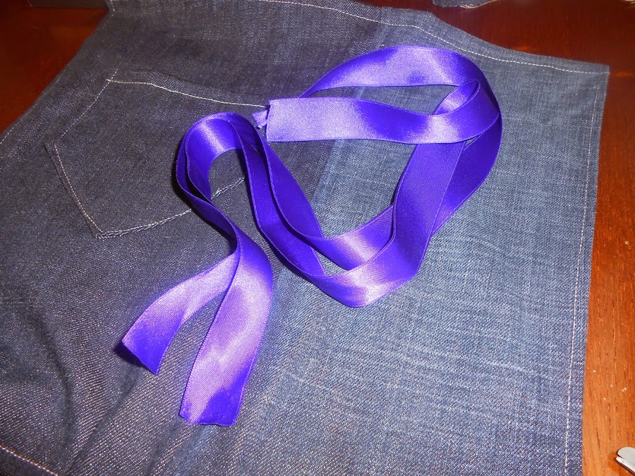 11/ Cogemos el lazo, lo doblamos sobre sí mismo y cosemos cada lazo a la parte de arriba de nuestro delantal.