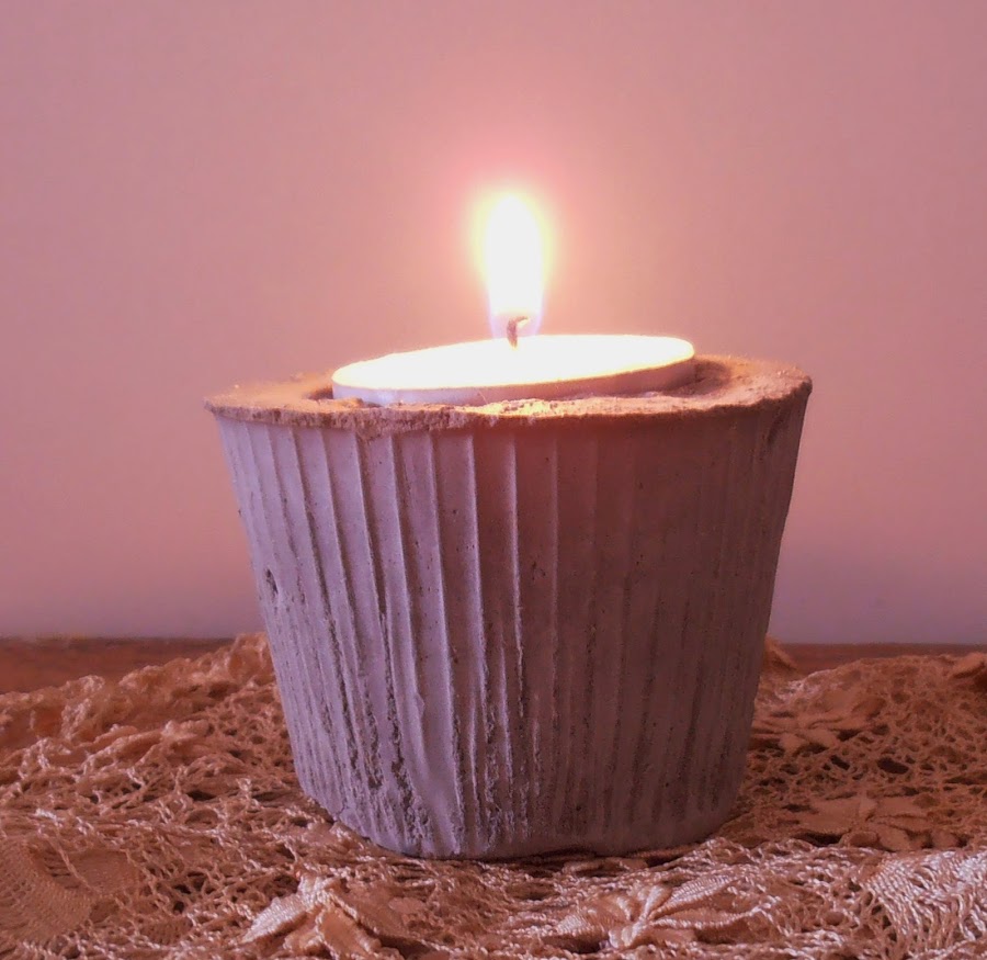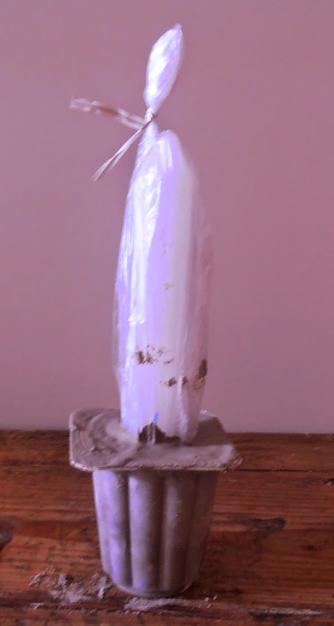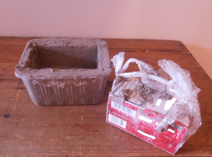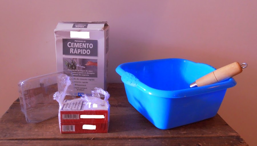 Hacer el cemento y rellenar el envase, dejar un dedo de margen. Introducir el objecto, (envuelto en plástico, así evitamos que se pegue al cemento) con la forma que queramos el agujero.