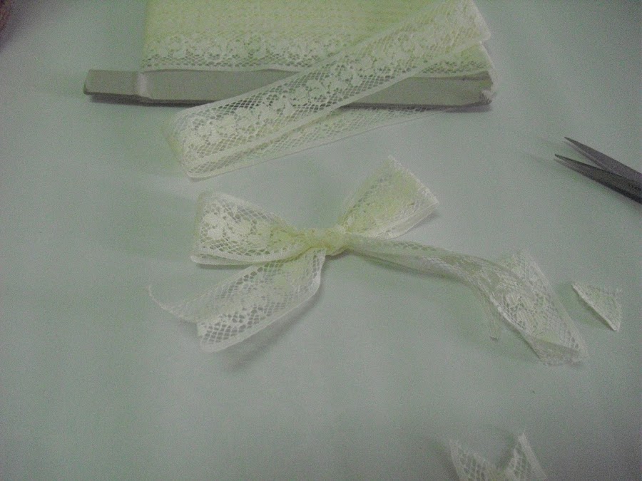 Ahora con la puntilla hacemos un lazo y cortamos la medida del ancho del bote para poner un tira en el borde...