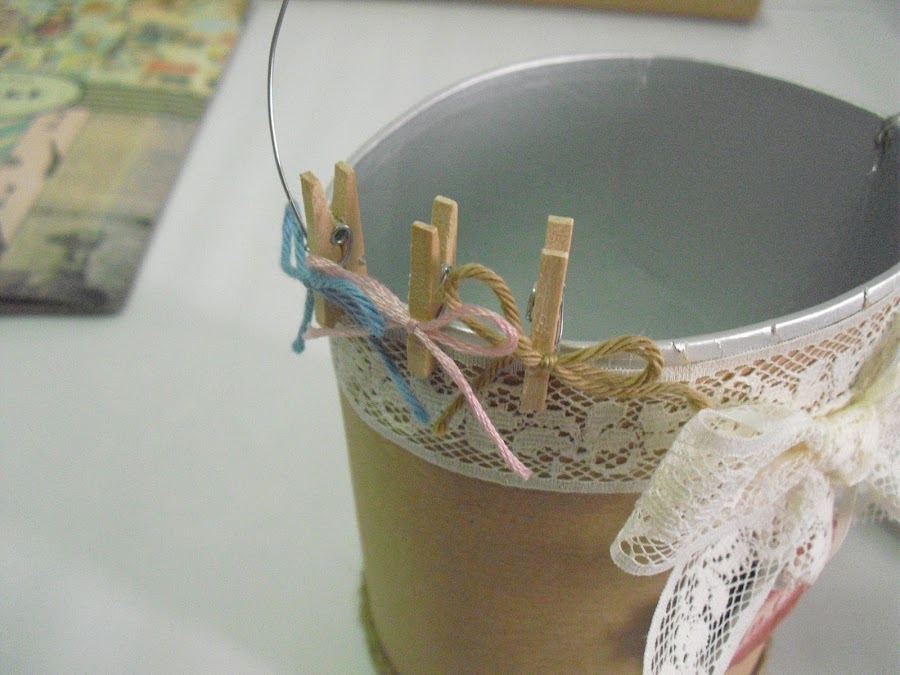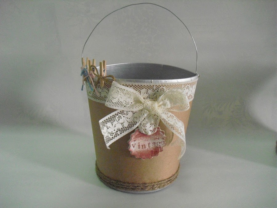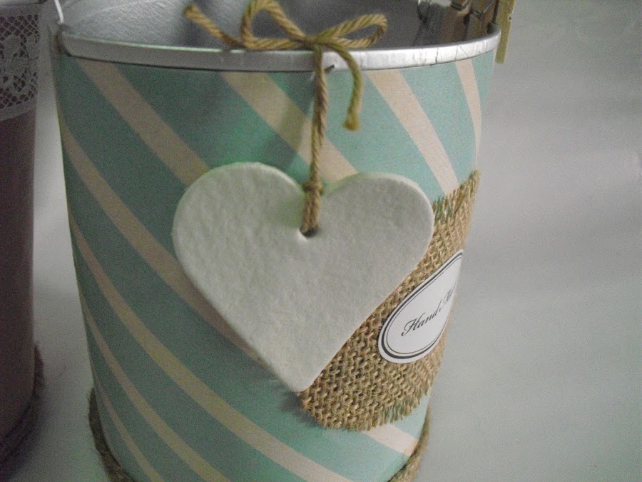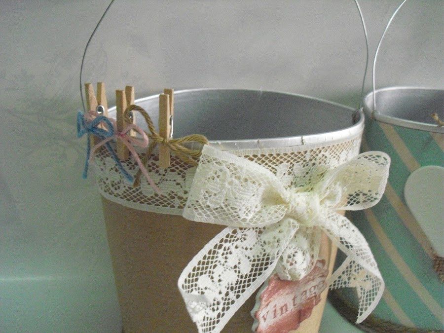 Si si, tenéis razón, no hemos usado la tela de arpillera, aquí podéis ver en qué la usé yo, el proceso de este cubo es igual pero sin puntilla... recortamos un ovalo de arpillera y podemos poner una etiqueta como hice yo o una de las blancas... hacemos un nuevo agujerito para colgar la etiqueta con un lacito y colocamos las pincitas, esta vez lisas... y listo!!!
