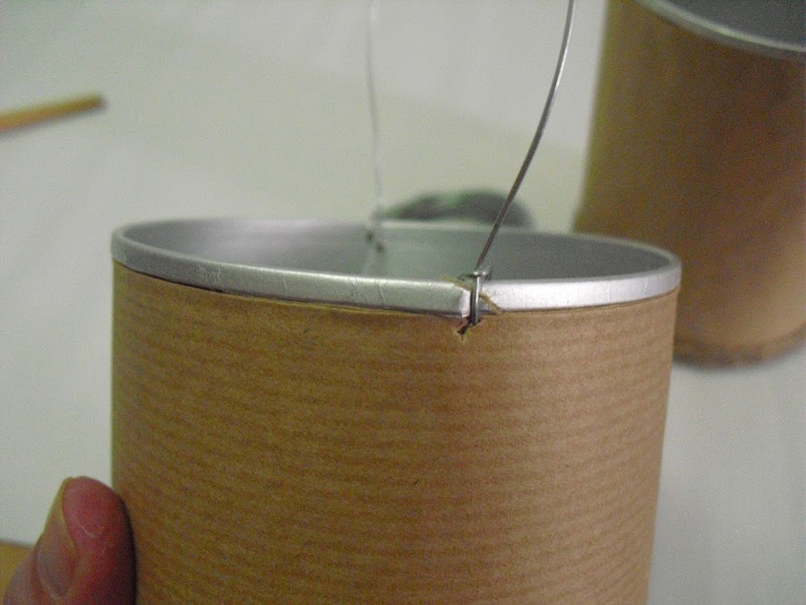 Hacemos un agujero a cada lado del bote para pasar el asa, uno de los motivos por el cual tenia que ser de cartón...