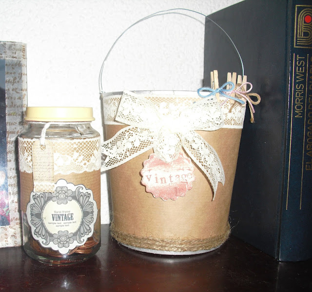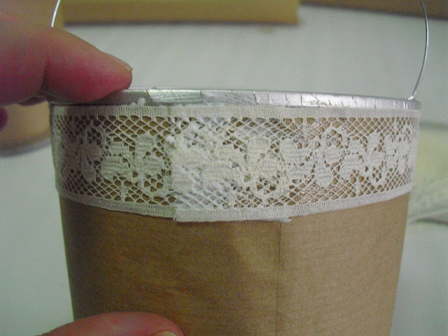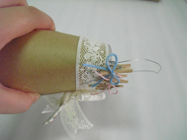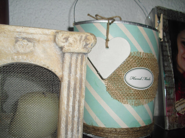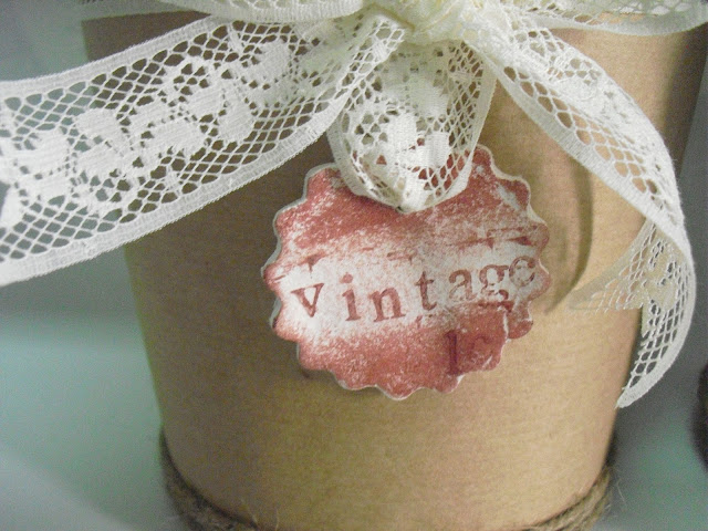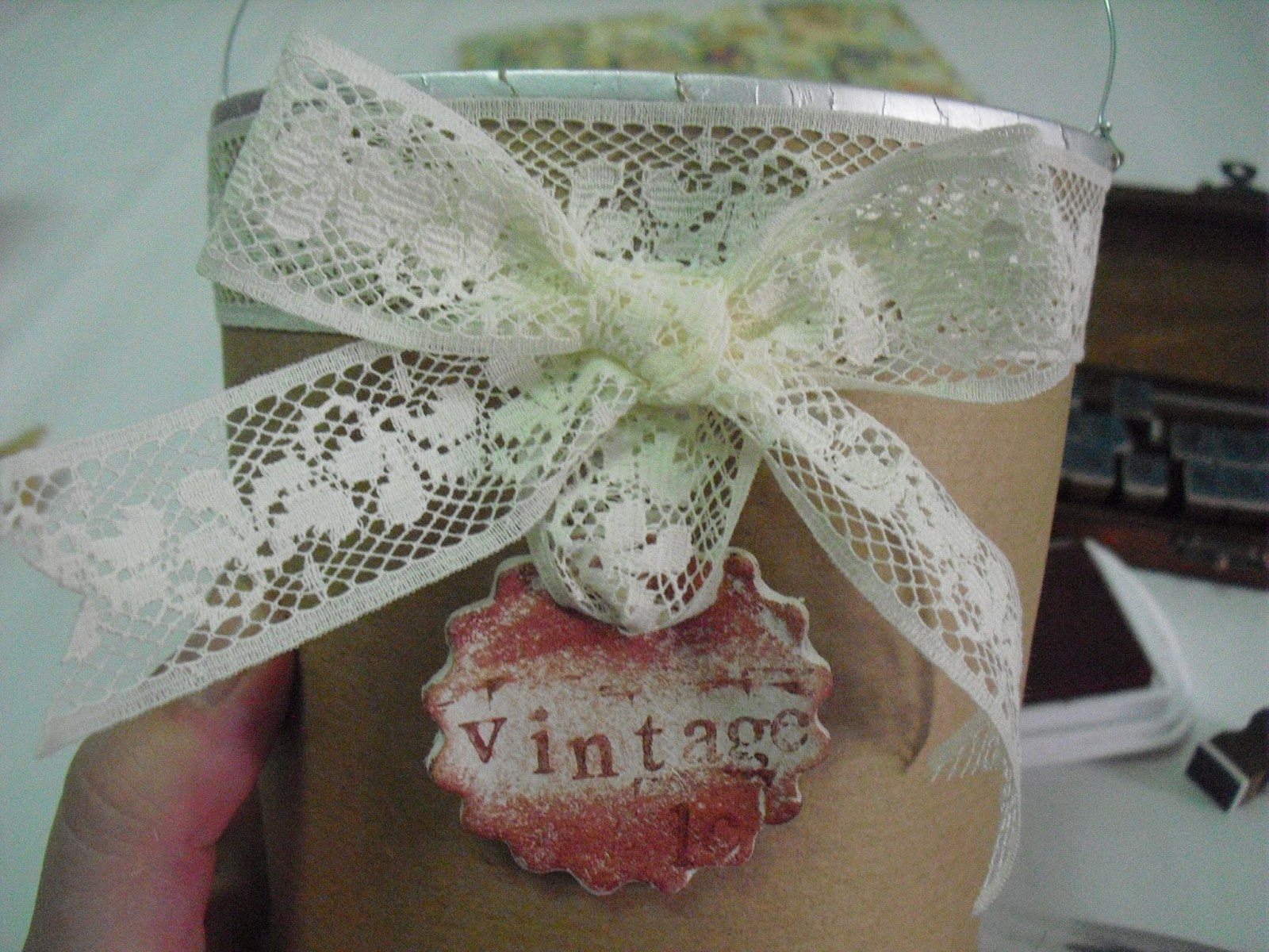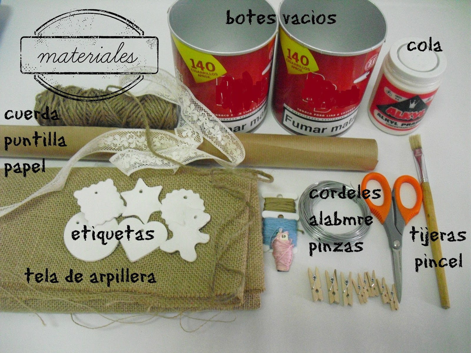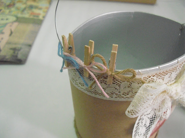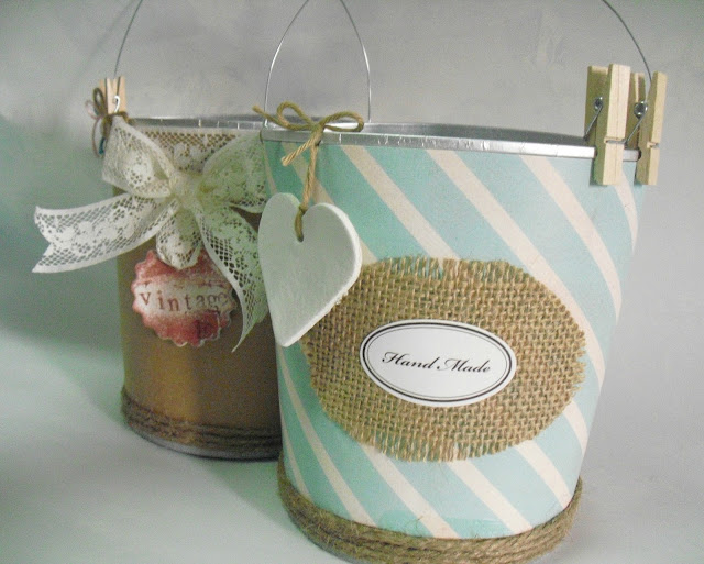 Si si, tenéis razón, no hemos usado la tela de arpillera, aquí podéis ver en qué la usé yo, el proceso de este cubo es igual pero sin puntilla... recortamos un ovalo de arpillera y podemos poner una etiqueta como hice yo o una de las blancas... hacemos un nuevo agujerito para colgar la etiqueta con un lacito y colocamos las pincitas, esta vez lisas... y listo!!!