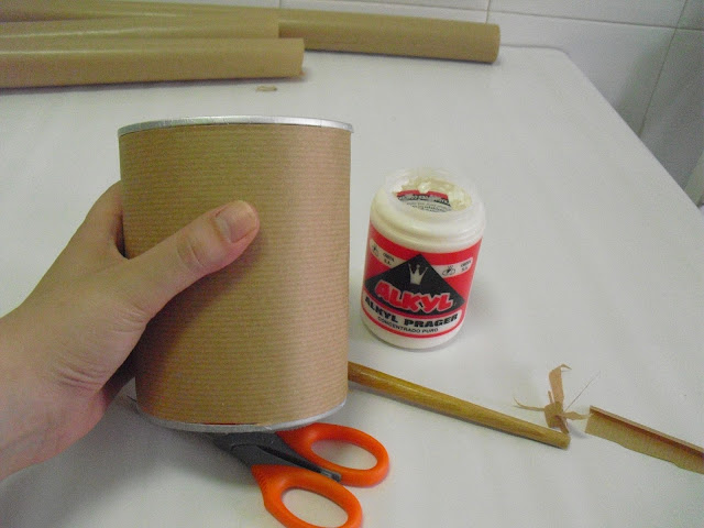 Hacemos un agujero a cada lado del bote para pasar el asa, uno de los motivos por el cual tenia que ser de cartón...