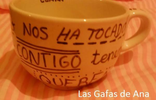 La frase que escribimos en la taza fue: No, este año tampoco nos ha tocado la lotería pero contigo tenemos todo lo que queremos. :)