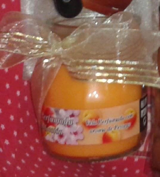 4-Para darle ambiente al desayuno, compramos una vela aromatizada con olor a melocotón y la decoramos con un lacito.