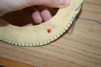 Atravesamos cada uno de los muñequitos de fieltro con el hilo transparente y lo cosemos a la base del alambre.