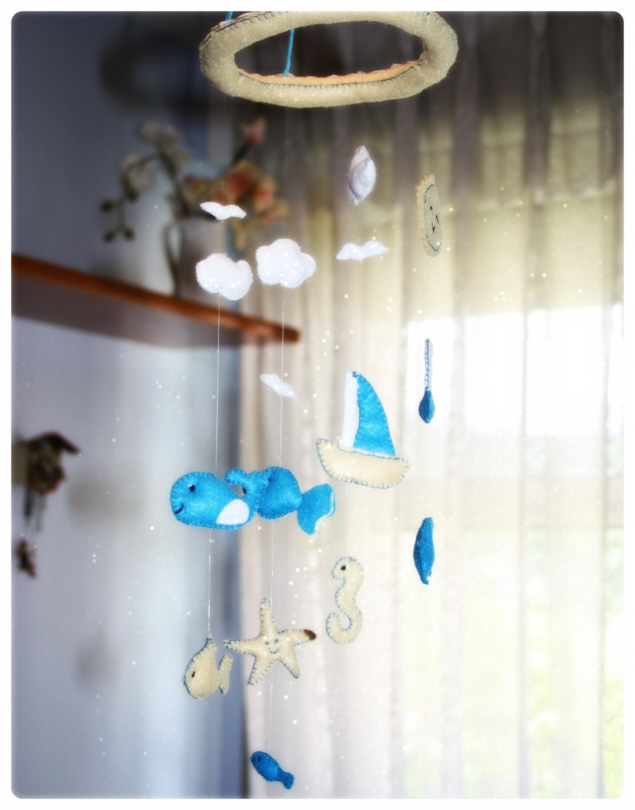 En este caso decidí, como os comentaba, hacer un móvil con motivos marineros, lleno de nubes y gaviotas blancas, peces de colores, alguna estrella de mar, y un sol con carita sonriente. Pero si os apetece podéis hacerlo con nubes, arco iris, animales, hadas, flores, etc.