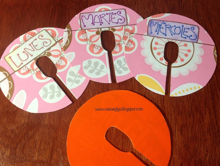 Luego forra con papel cada lado de los separadores y pégale la etiqueta de los días de la semana. Para hacer el circulo central te puedes guiar del mismo circulo del Cd, en mi caso nuestro tubo de colgar ropa es como aplastado y no tan circular.