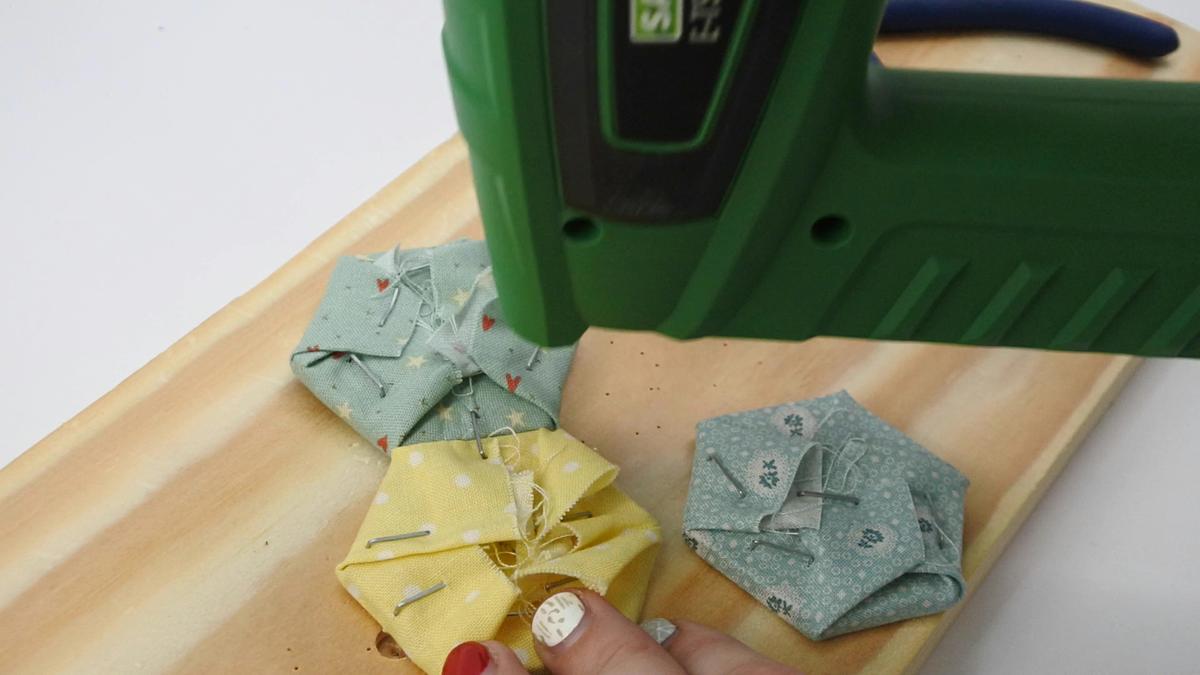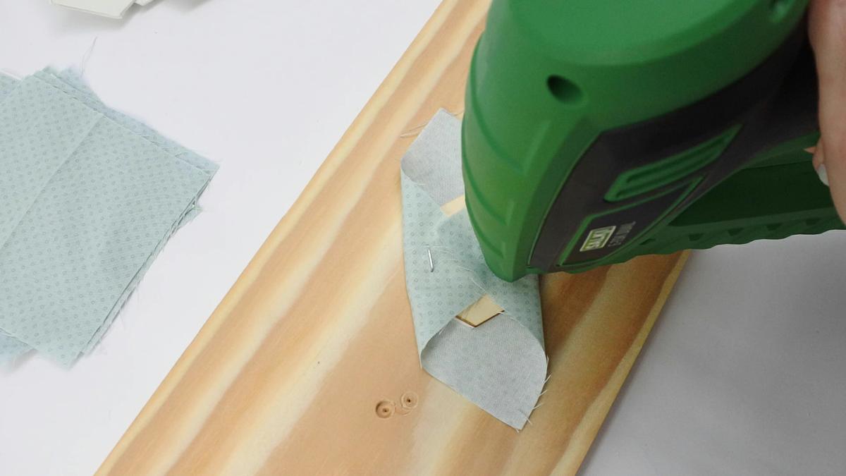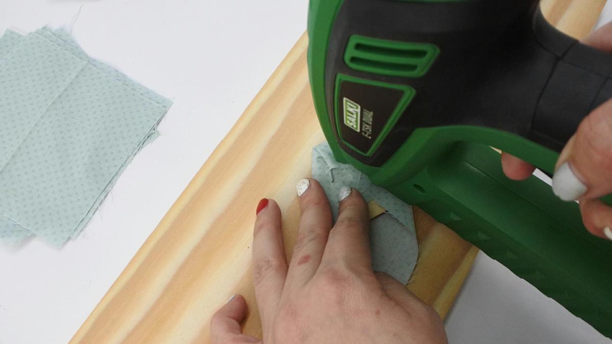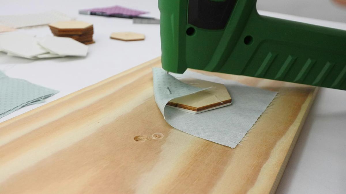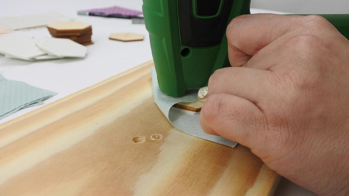 Vamos a forrar nuestras piezas con las diferentes telas de colores. Para ello nos ayudaremos de una grapadora para que la tela quede bien tensa y consigamos de este modo el efecto deseado.