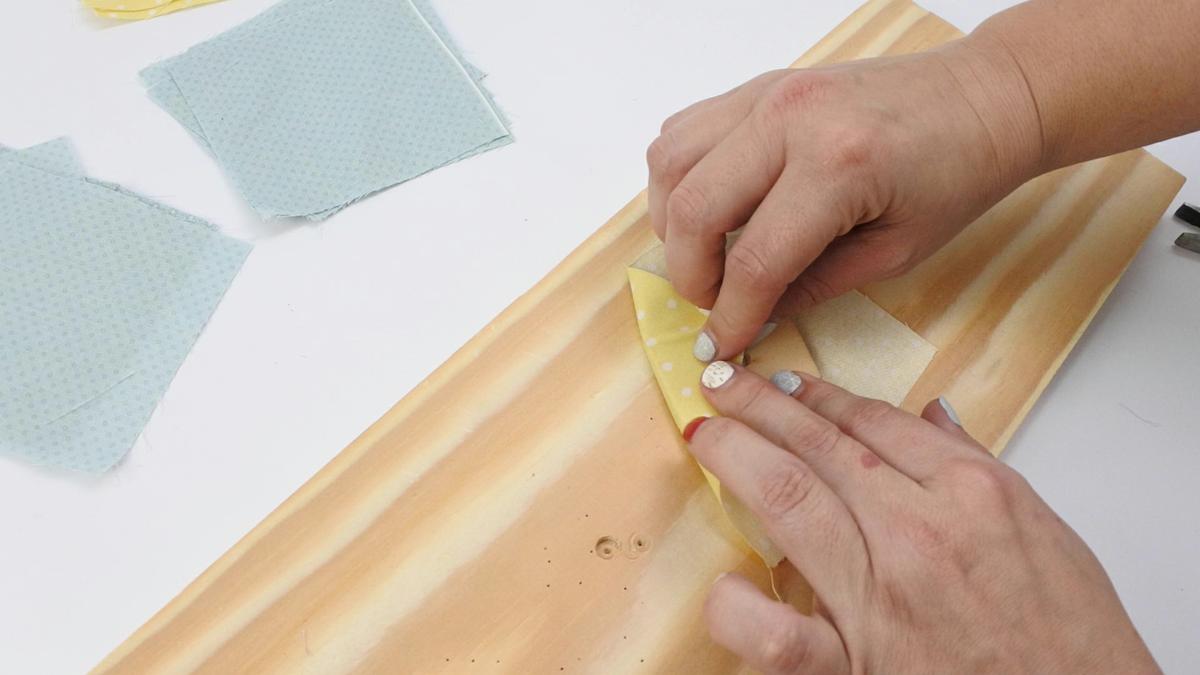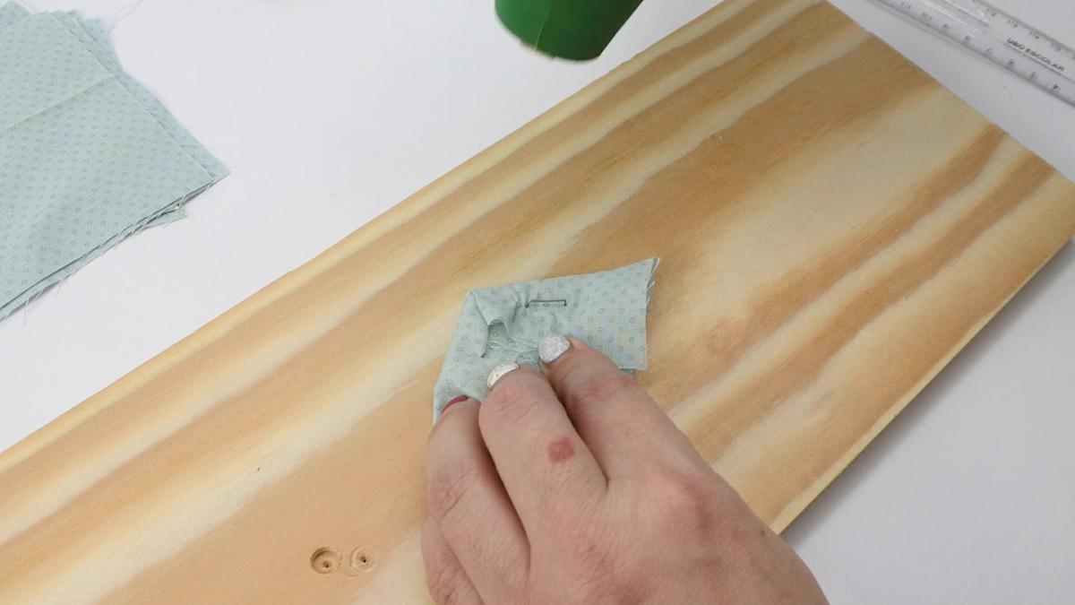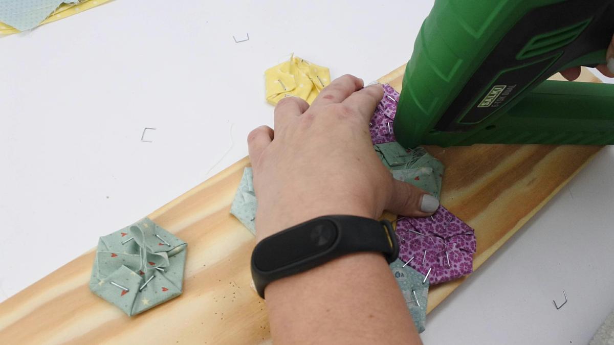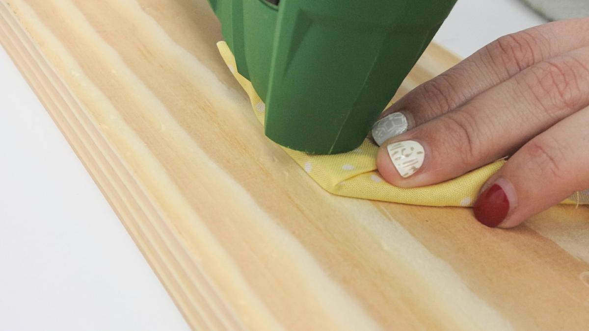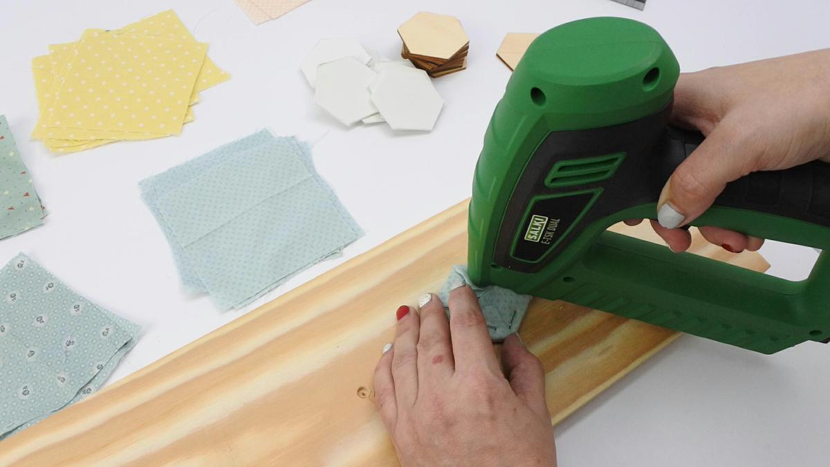 Vamos a forrar nuestras piezas con las diferentes telas de colores. Para ello nos ayudaremos de una grapadora para que la tela quede bien tensa y consigamos de este modo el efecto deseado.