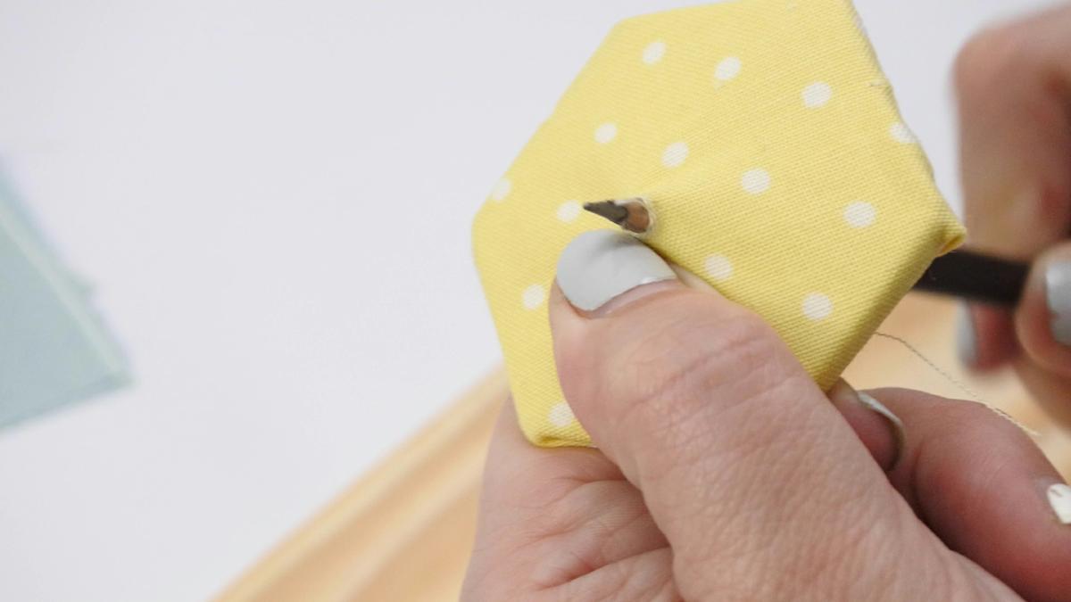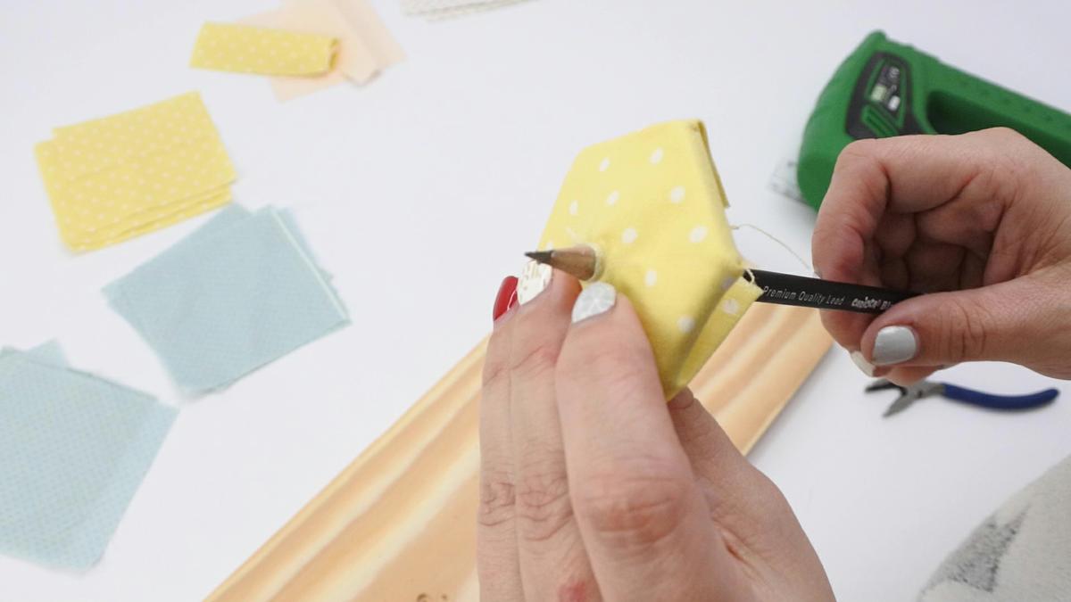 Por el trasero de la pieza, abrimos la tela hasta ver el agujero y lo atravesamos con el lápiz de modo que abramos la gomaeva y la tela.
