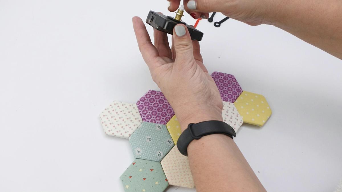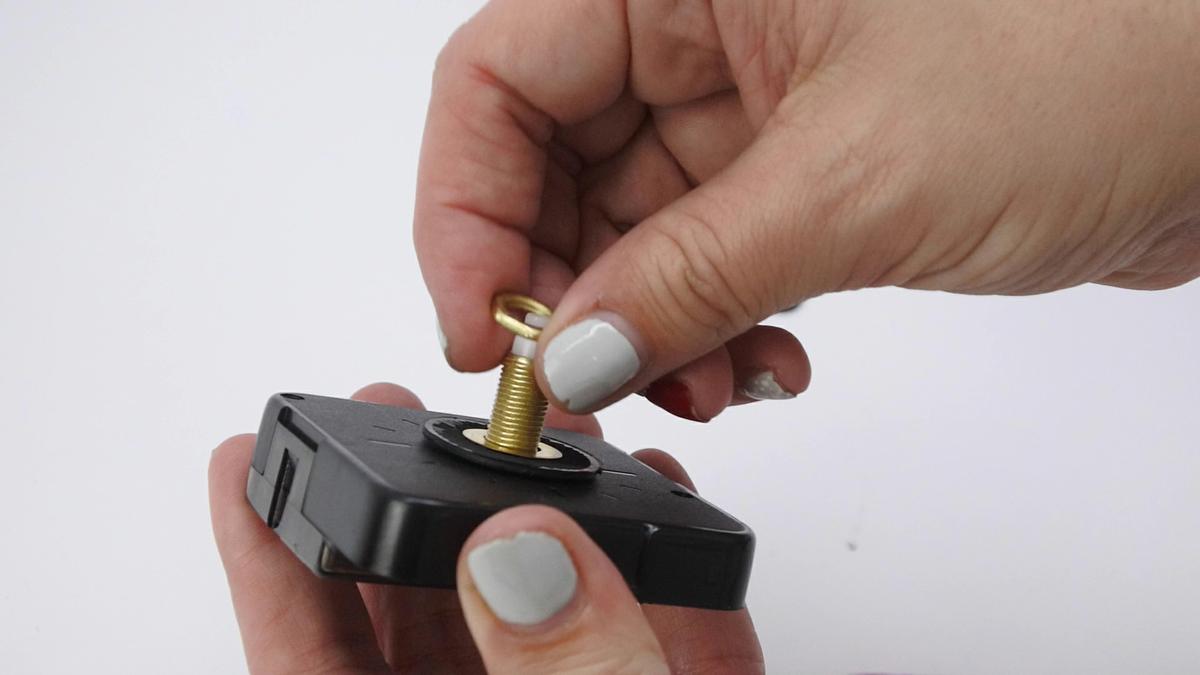 Con las piezas unidas entre sí, es el momento de colocar el mecanismo del reloj. Los nuestros son de Innspiro. Nos gusta el diseño de las saetas rectas y sencillas.