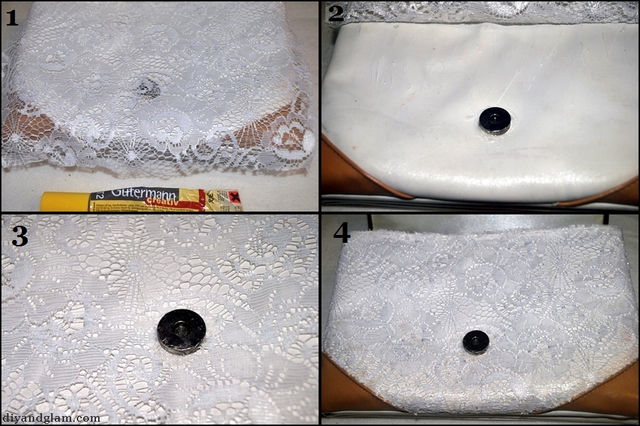 Lo primero que vamos a hacer es cortar un cuadrado de la tela de guipur con el tamaño del bolso. Nos va a sobrar tela, pero es mejor así. El guipur lo vamos a pegar en toda la parte blanca del bolso, esa que estaba abombada. Aplicamos el pegamento empezando por arriba y vamos poco a poco pegando la tela.