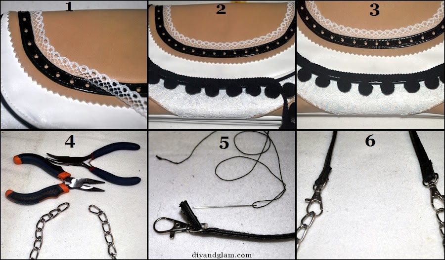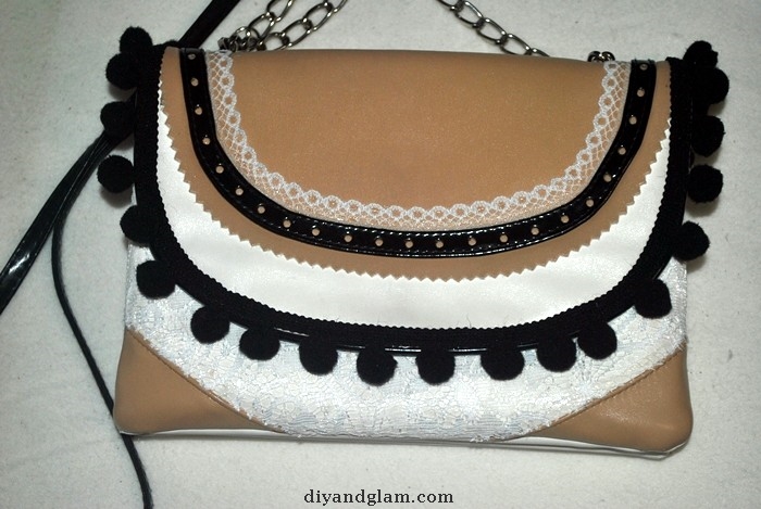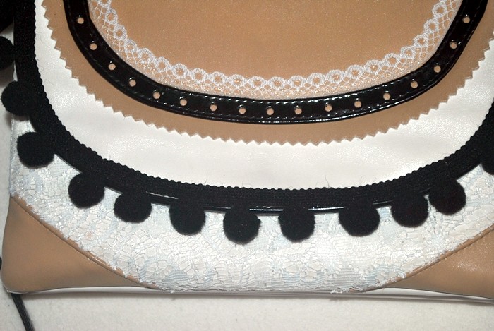 Ahora vamos con la tapa del bolso. Aquí lo importante es tapar toda la zona estropeada. Para ello pegamos una tira de madroño por todo el borde de la tapa. Para unificar el cuerpo del bolso con la tapa pegamos una tira de encaje, esta va estupendamente con el guipur.