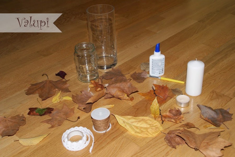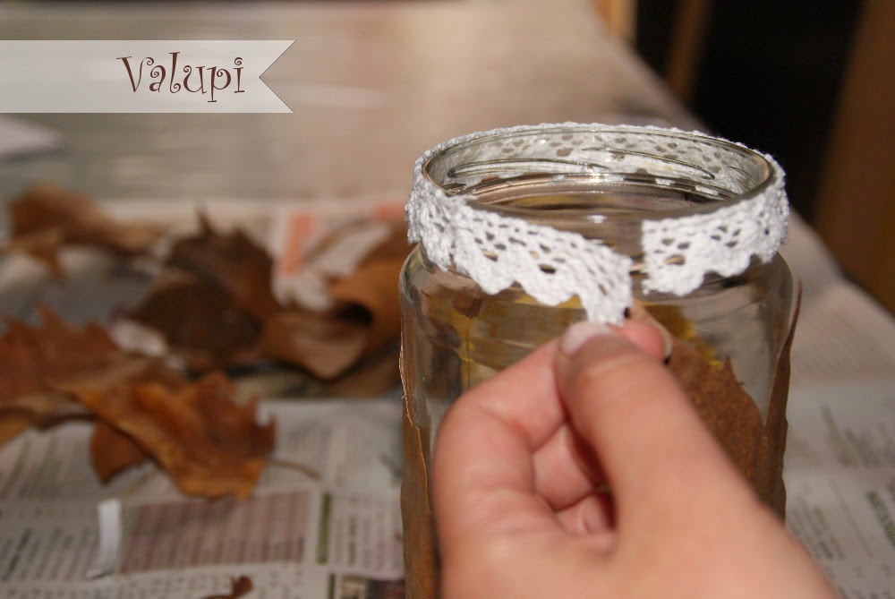 Velas.Para realizar el decorado más sencillo, simplemente tenemos que atar la cuerda alrededor del jarrón y colocar las hojas de árbol secas a nuestro gusto.