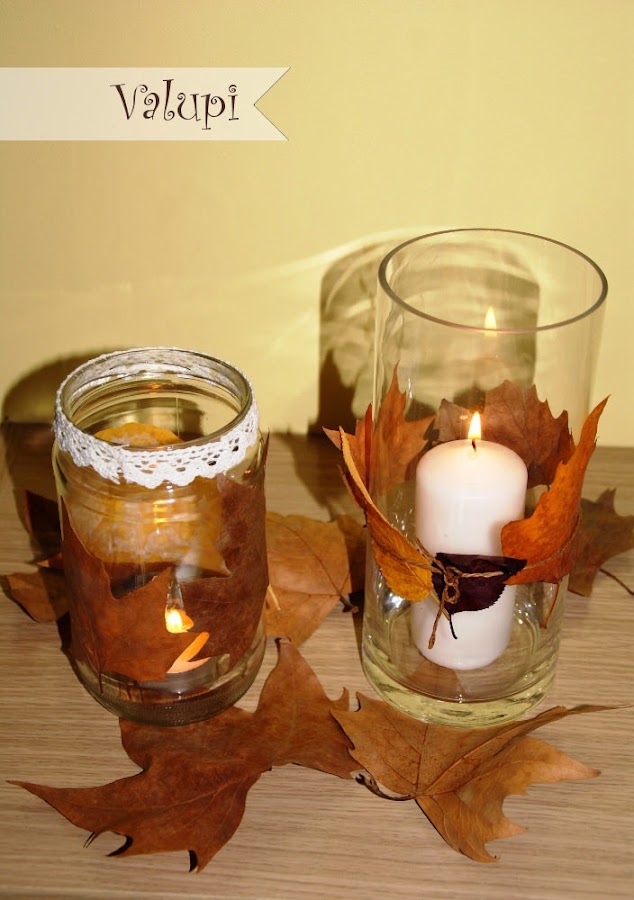 Si colocamos dentro una vela ancha y alta, ya tenemos los dos centros otoñales listos.