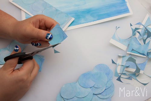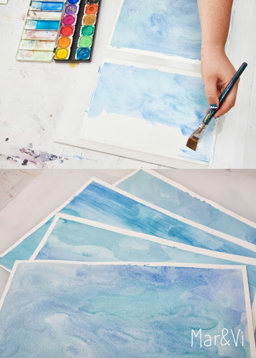 1- Pegamos las hojas de papel a la mesa de trabajo con cinta de carrocero por todos los bordes, para evitar que se ondule cuando la mojamos. Luego pintaremos con acuarela del color deseado, tratando de lograr diferentes tonalidades, ya sea usando dos colores diferentes (como he hecho yo con un celeste y un azul), o bien usando el color más o menos diluído con agua. Dejamos secar muy bien, hasta que el papel vuelva a estar "planchado". Giramos y repetimos el procedimiento del otro lado.